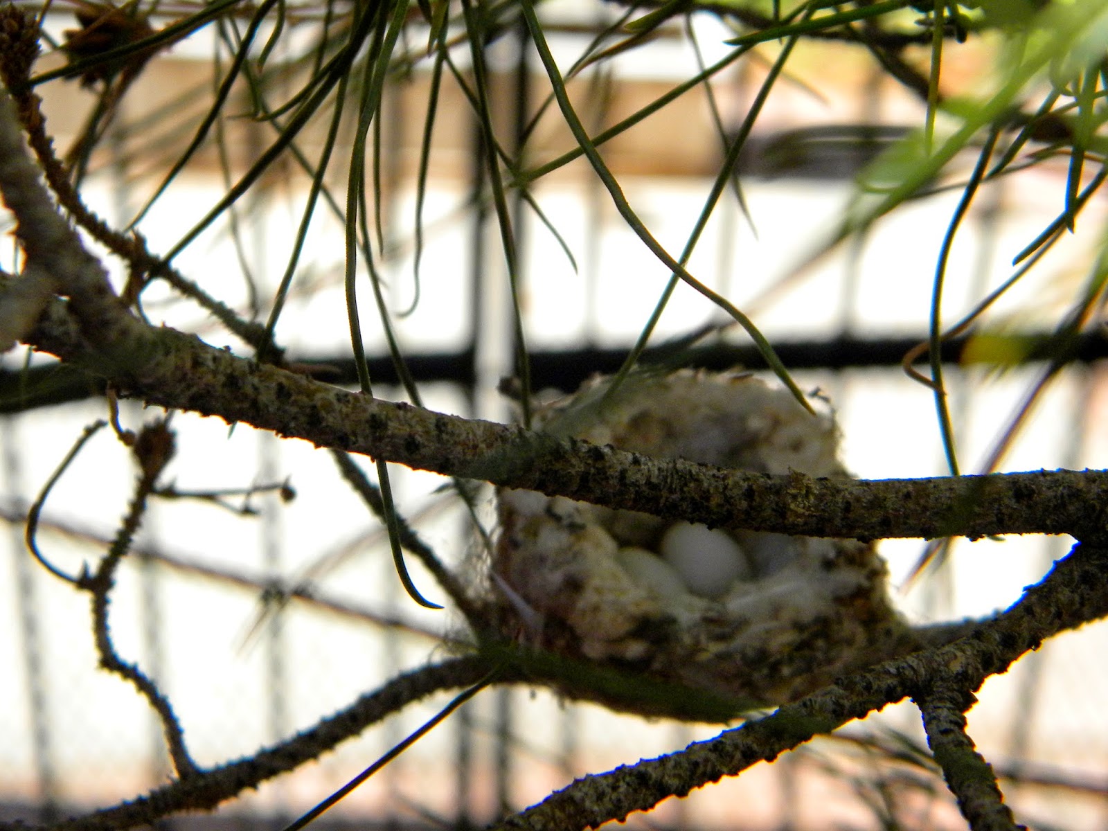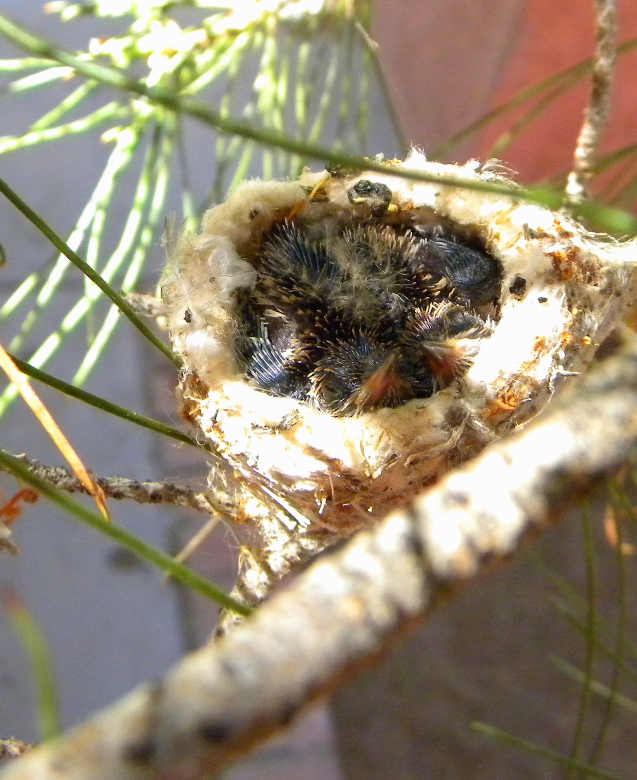 Another day we noticed a hummingbird who was building her nest about 8 feet above in our pine tree.  We have watched her build her nest, lay eggs, hatch them & now are watching her babies grow.  This is Lovely, the Mama, and her babies Lucy & Ruckus.