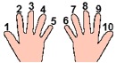 First, hold both your hands out in front of you, with palm open and facing you. Now, starting with your left thumb, number your fingers from left to right, ending on the right thumb. In this way, your left pinkie is 5 and your right pointer if 9, for example. Get it?